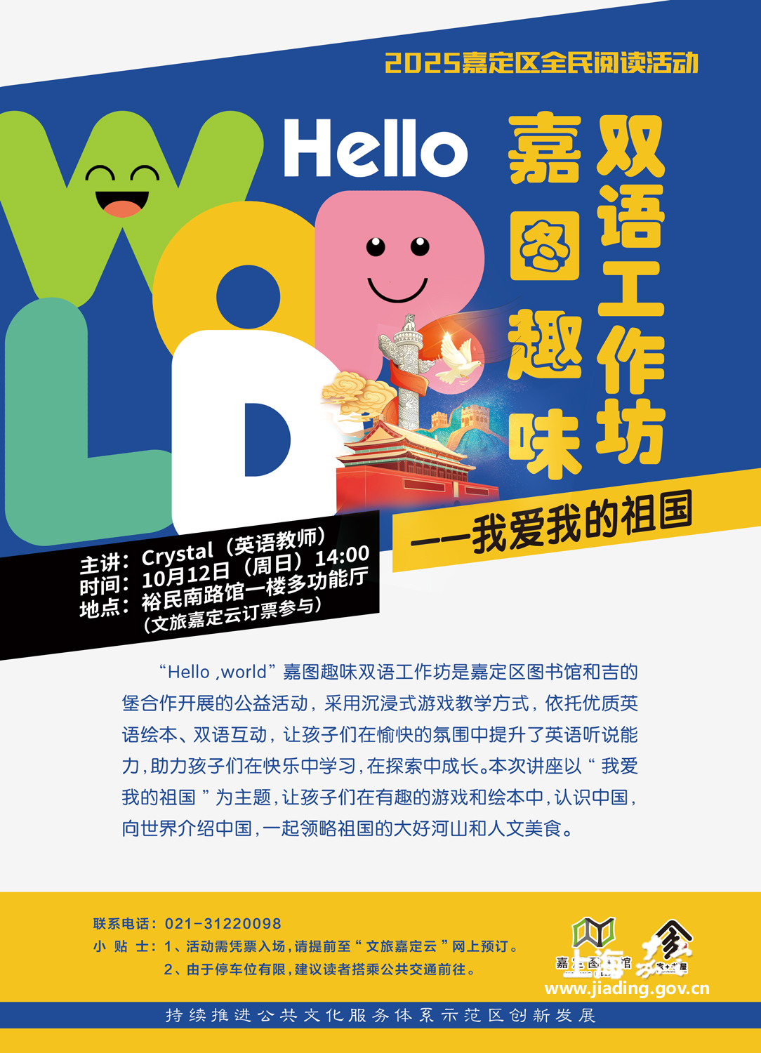 “Hello ,world”嘉图趣味双语工作坊是嘉定区图书馆和吉的堡合作开展的公益活动,采用沉浸式游戏教学方式,依托优质英语绘本、双语互动,让孩子们在愉快的氛围中提升了英语听说能力,助力孩子们在快乐中学习,在探索中成长。本次讲座以“我爱我的祖国”为主题,让孩子们在有趣的游戏和绘本中,认识中国,向世界介绍中国,一起领略祖国的大好河山和人文美食。