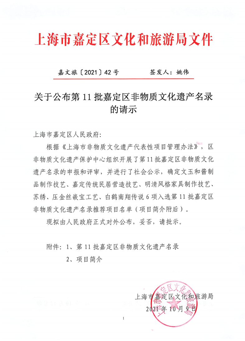 索引号: WC3302000-2021-006 发布机构: 区文化旅游局 发文日期: 2021年10月09日 主题分类: 依申请转主动公开文件 关键词: 关于公布第11批嘉定区非物质文化遗产名录的请示 发布时间:2021-10-09 浏览次数: 次 【字体:小 大】
